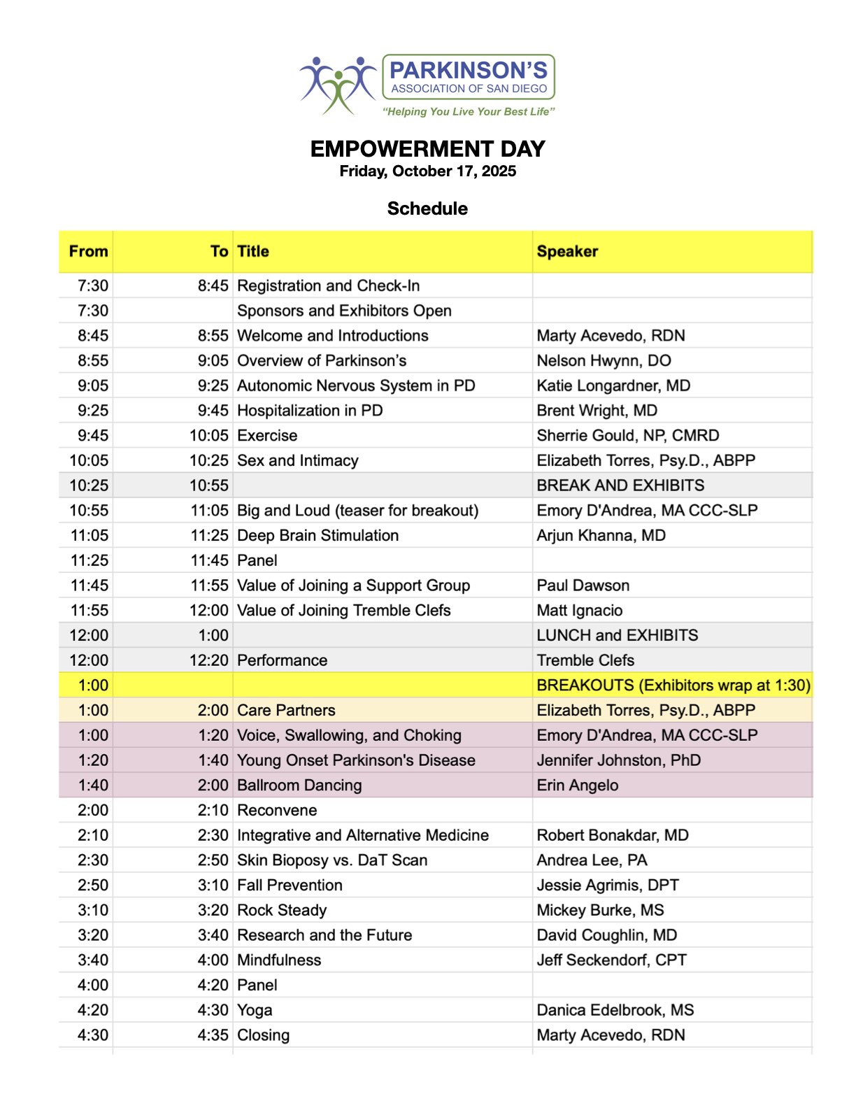 Provide a scholorship. This year, when you register online and during checkout, you will have the option to purchase additional “scholarship seats.” We will offer these scholarships to those in our San Diego Parkinson’s community who may need some financial assistance to attend this year’s Empowerment Day. We thank you for your generous support.