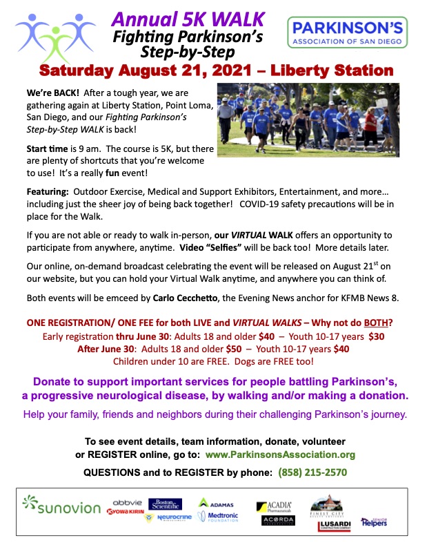 Fight Parkinson’s disease by joining us for our annual 5K Walk in support of the Parkinson’s Association of San Diego! This year, join us in-person or virtual!